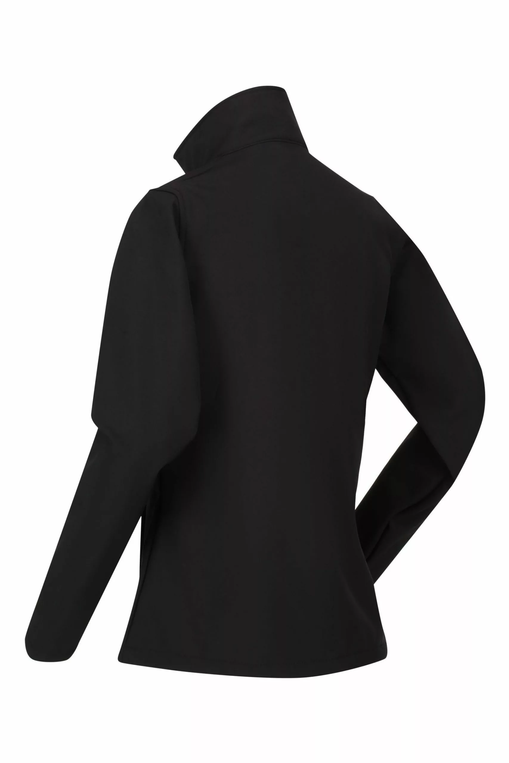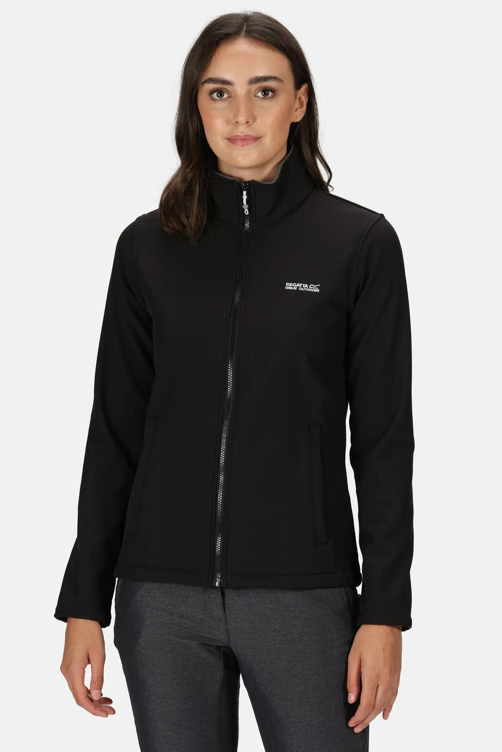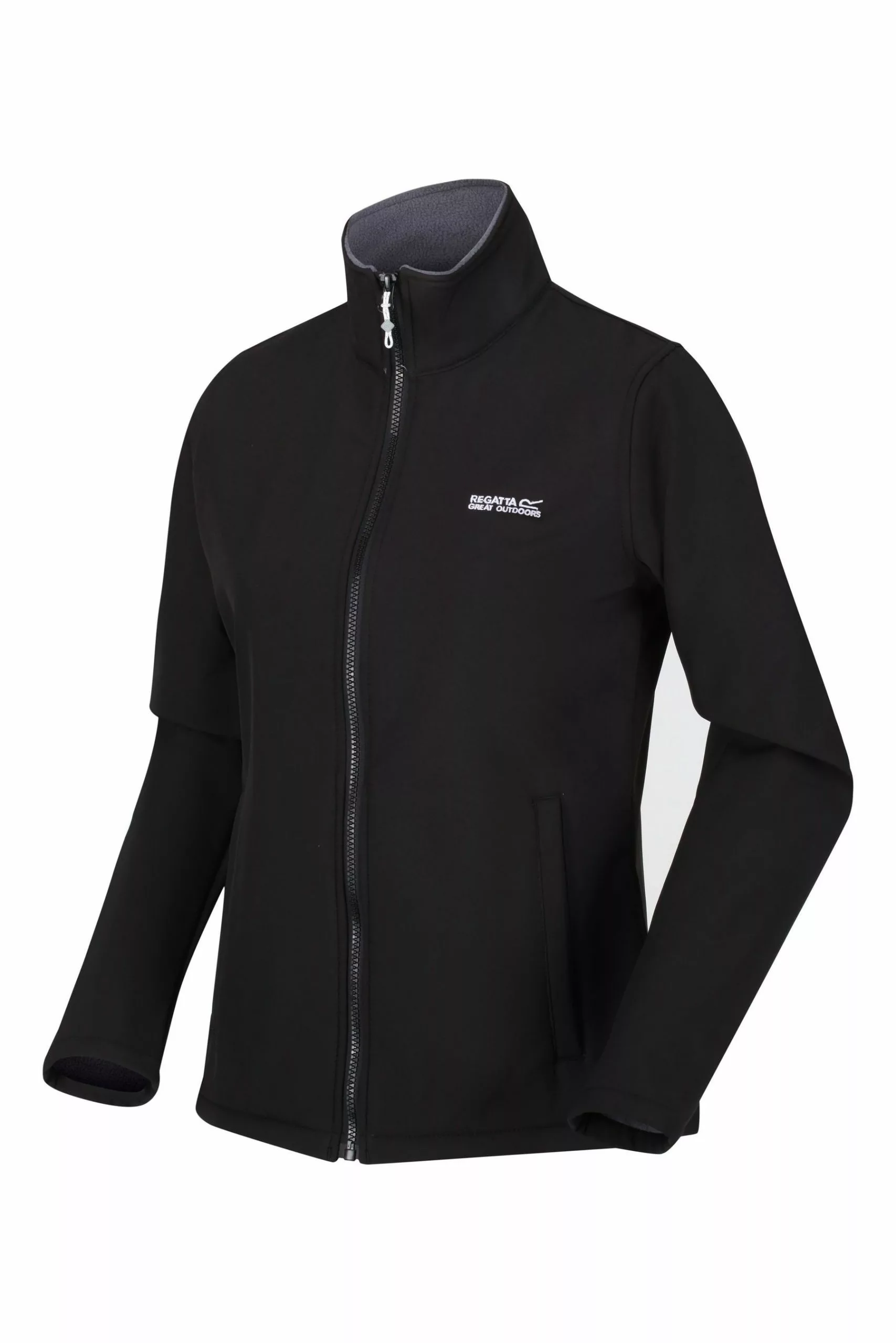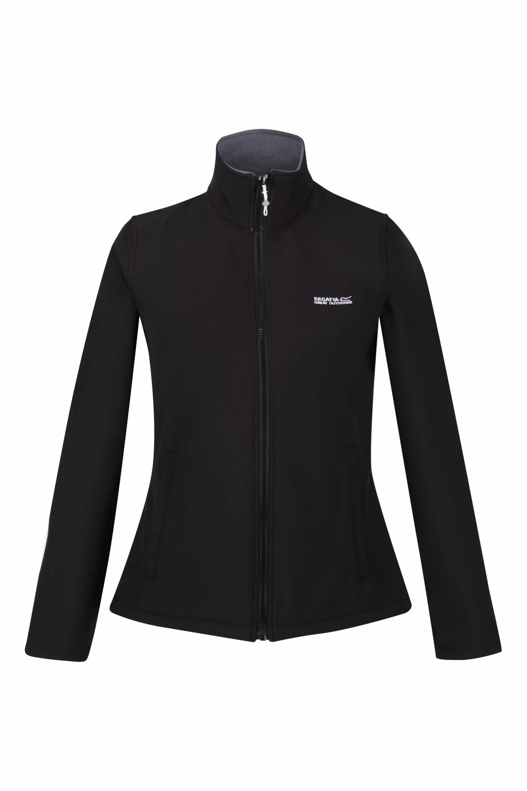 The Connie Softshell Jacket from Regatta is made of soft, warm-backed stretch fabric with a DWR (Durable Water Repellent) finish to provide wind and water resistance. With zipped side pockets and the Regatta Outdoors print on the chest.