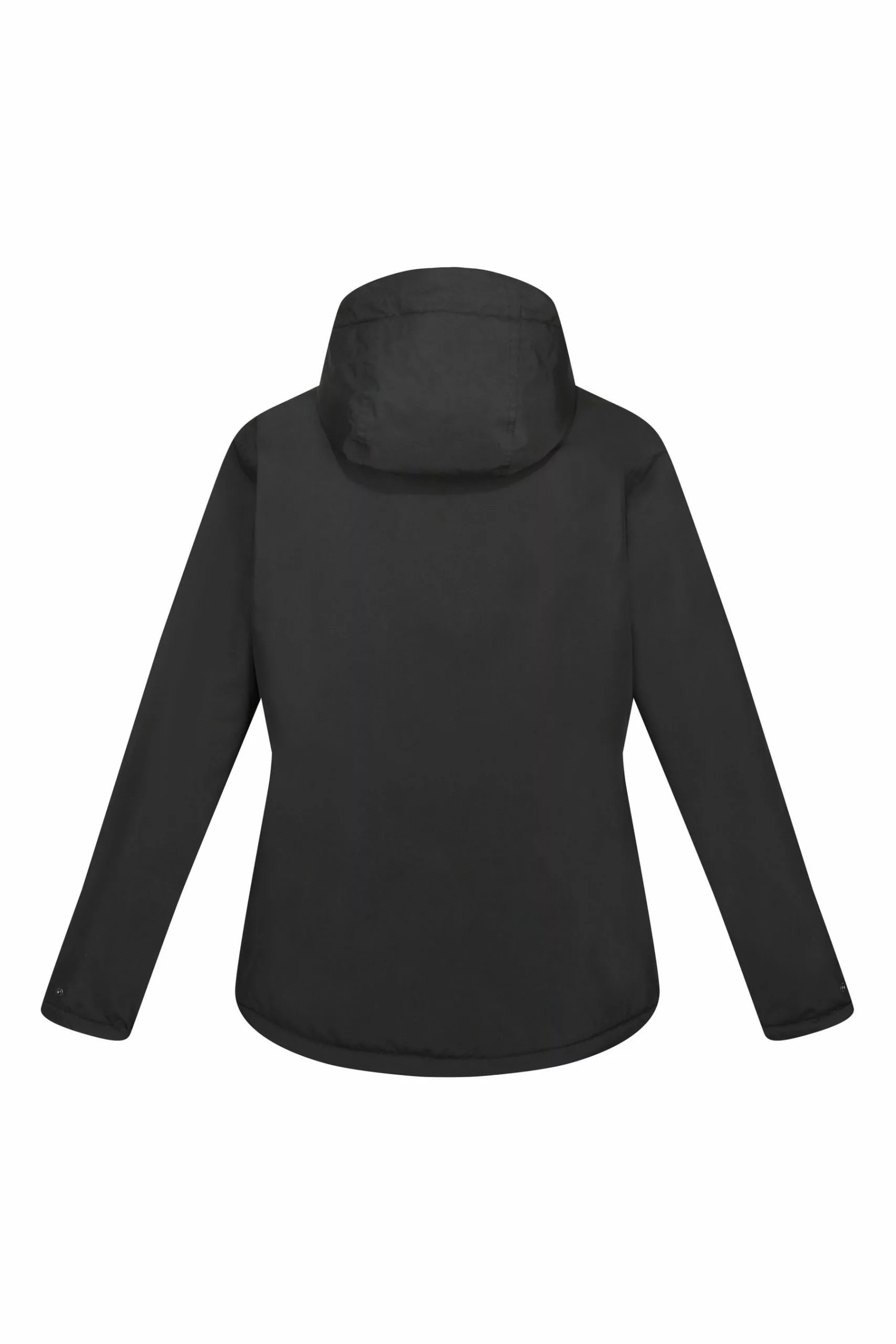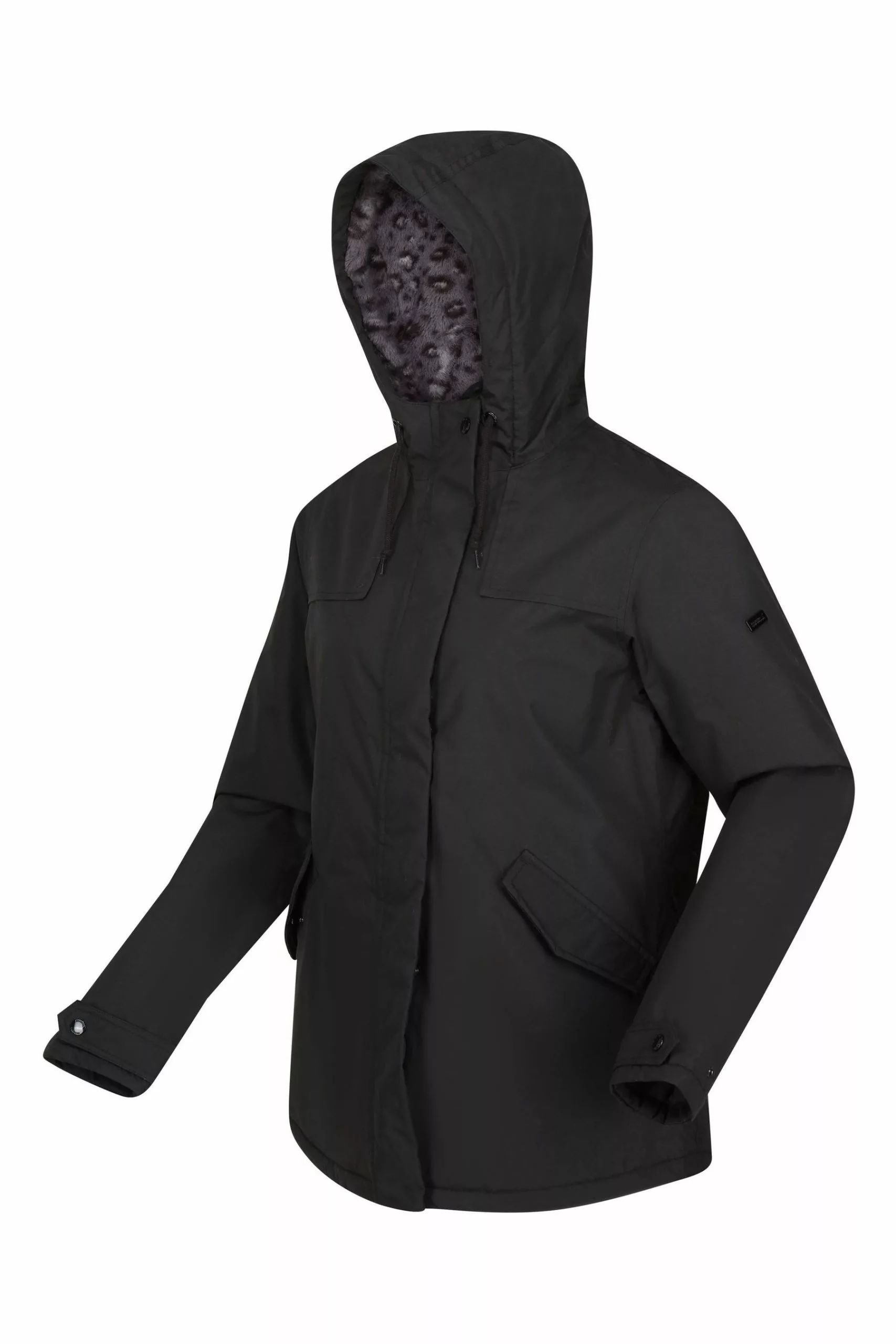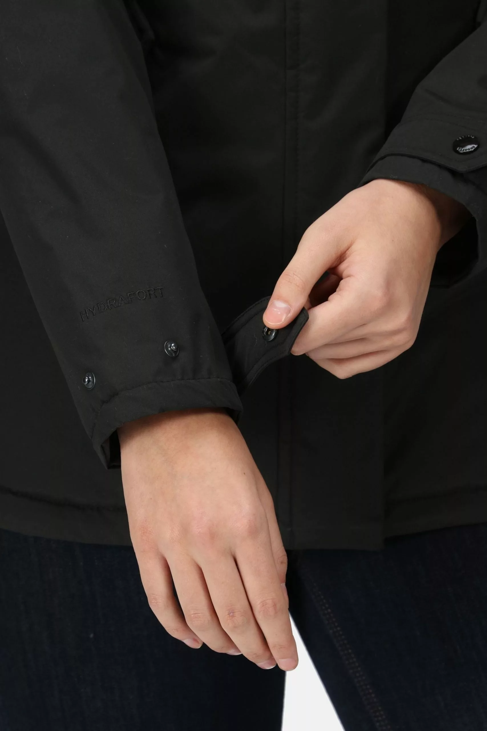 The Bria women s waterproof jacket from Regatta will complete your outdoor getup in style. The ladies jacket is made with waterproof Hydrafort fabric to see off rain. The taped seams help to keep the elements at bay. The cold weather won t get a look in with the Thermoguard insulation. The luxury fur trim to the hood adds style.