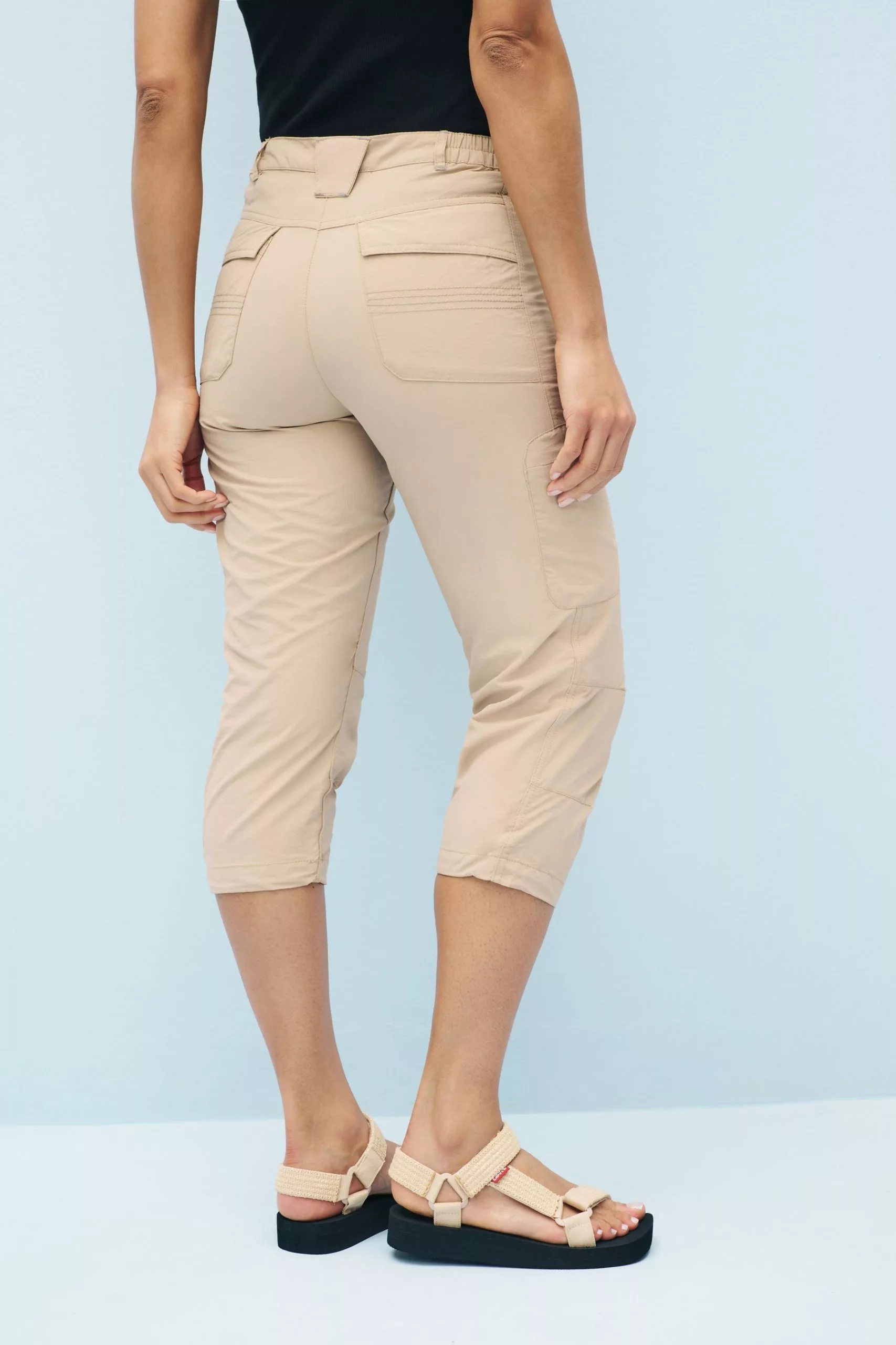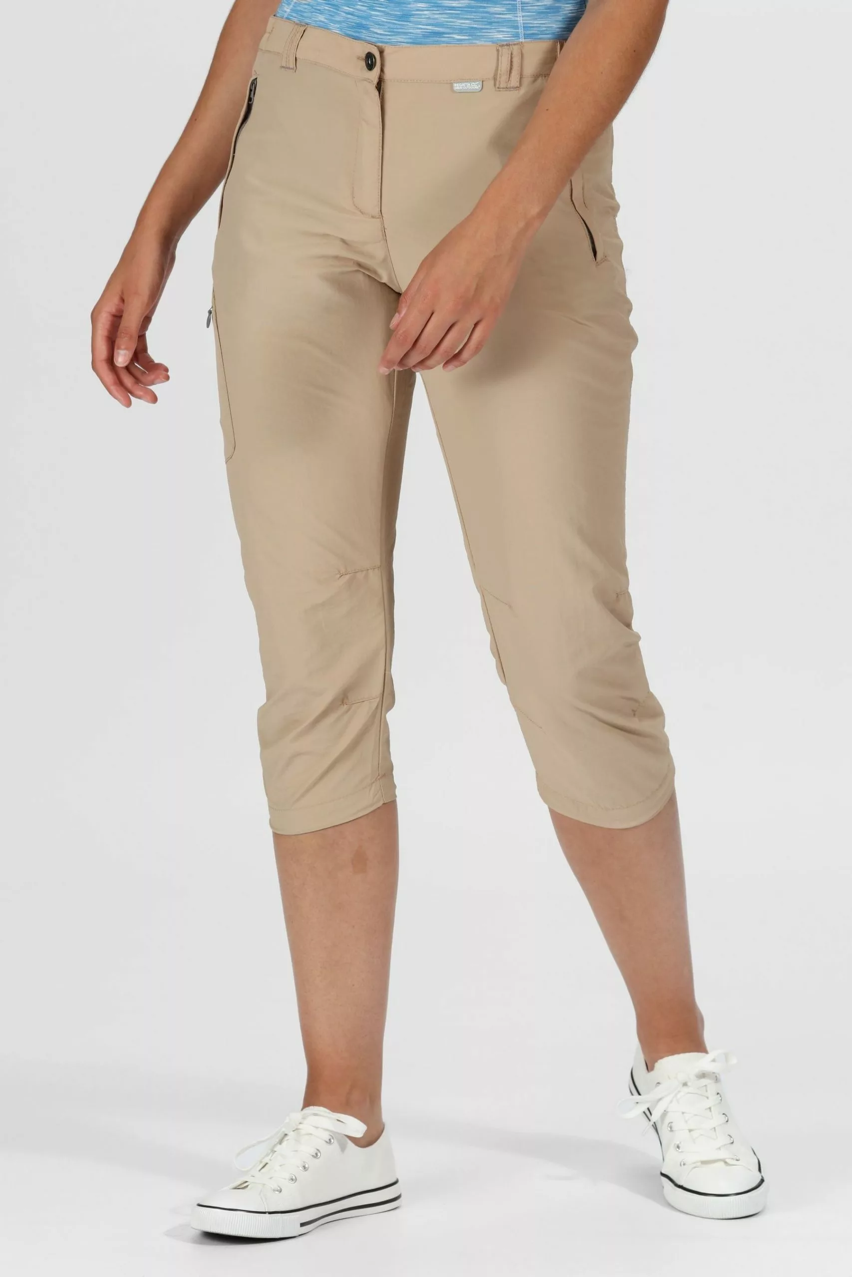 Lightweight, showerproof capris with 40+ UPF sun protection, for warm-weather hiking, trekking and travelling. Made from durable polyamide fabric with a DWR (Durable Water Repellent) finish to stave off showers. The wrinkle-resistant material is soft and light to wear and dries quickly when wet. Elastic at the waist and two-way adjust toggles at the hem deliver a close, comfortable fit that moves and stretches with you. Packs down small. For travelling light and far. With the Regatta print on the left leg.