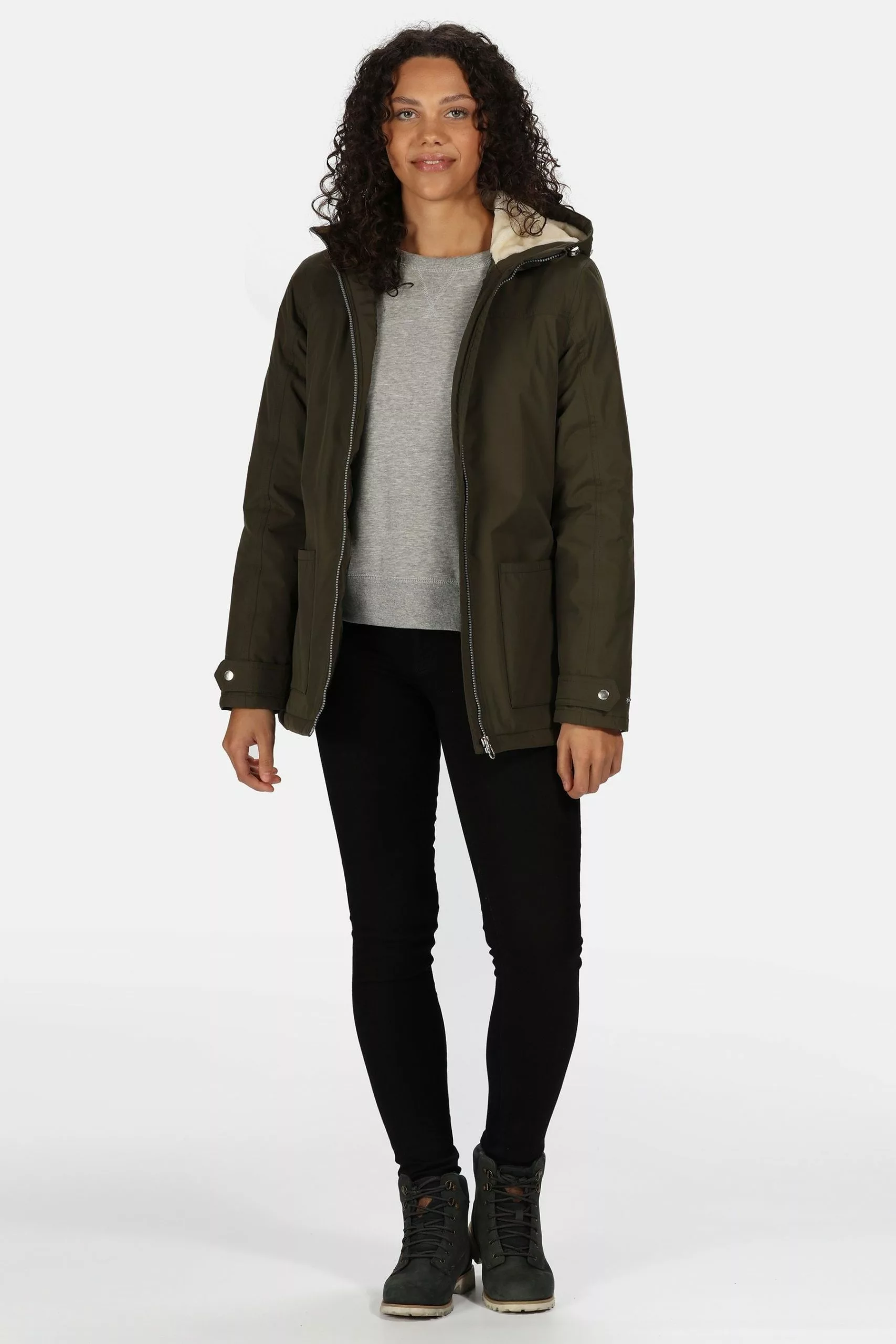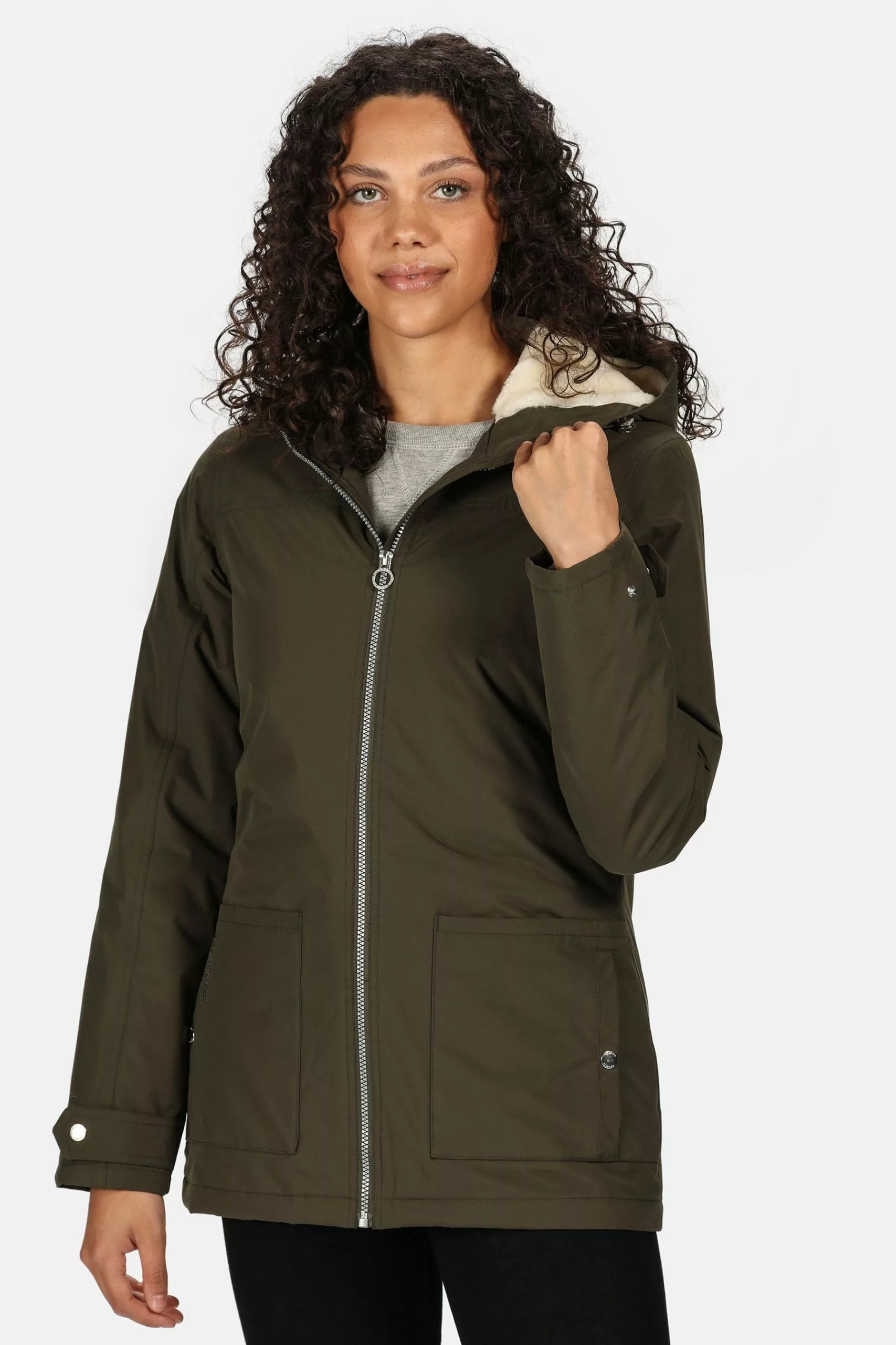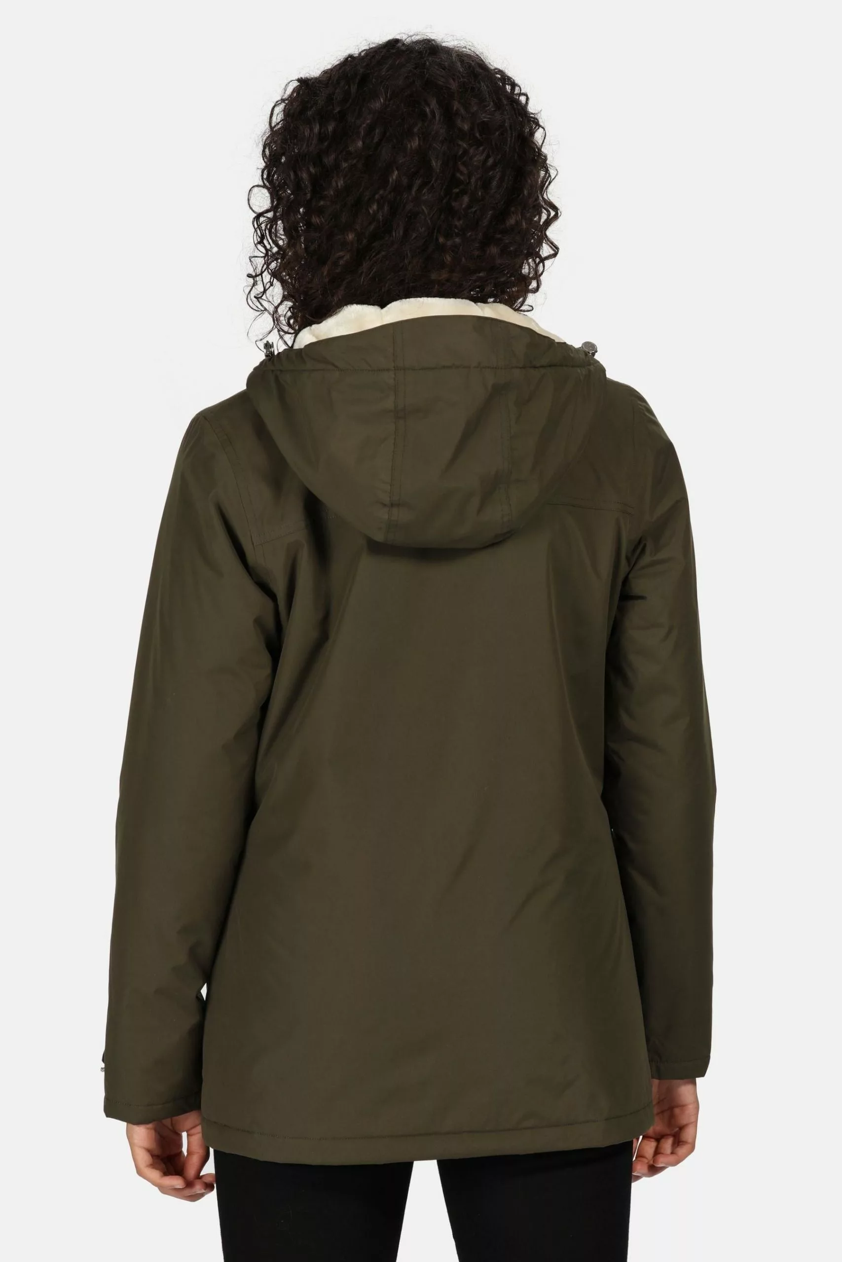 - Cut hip length with curved side seams and warming faux-fur trims.
