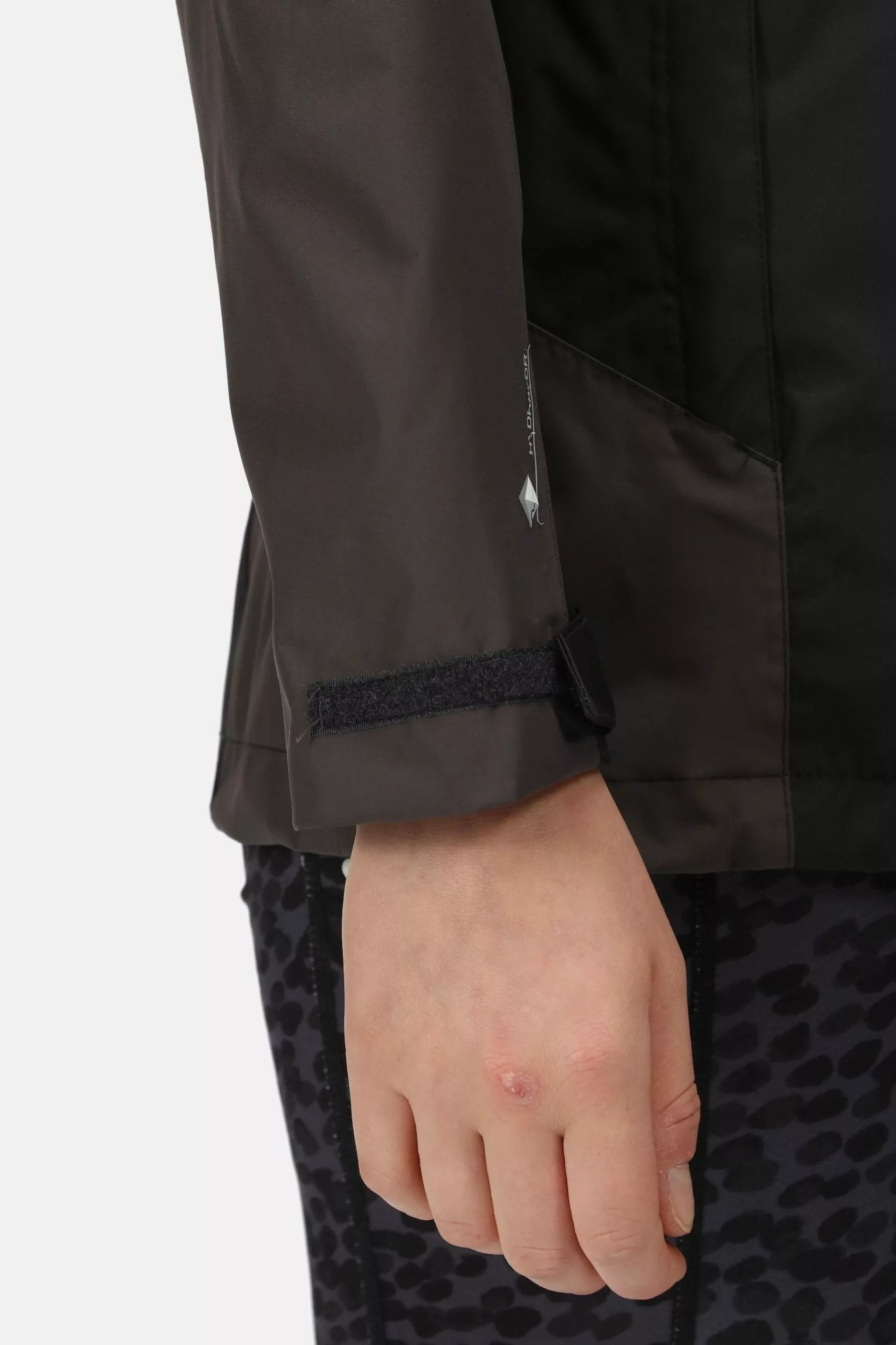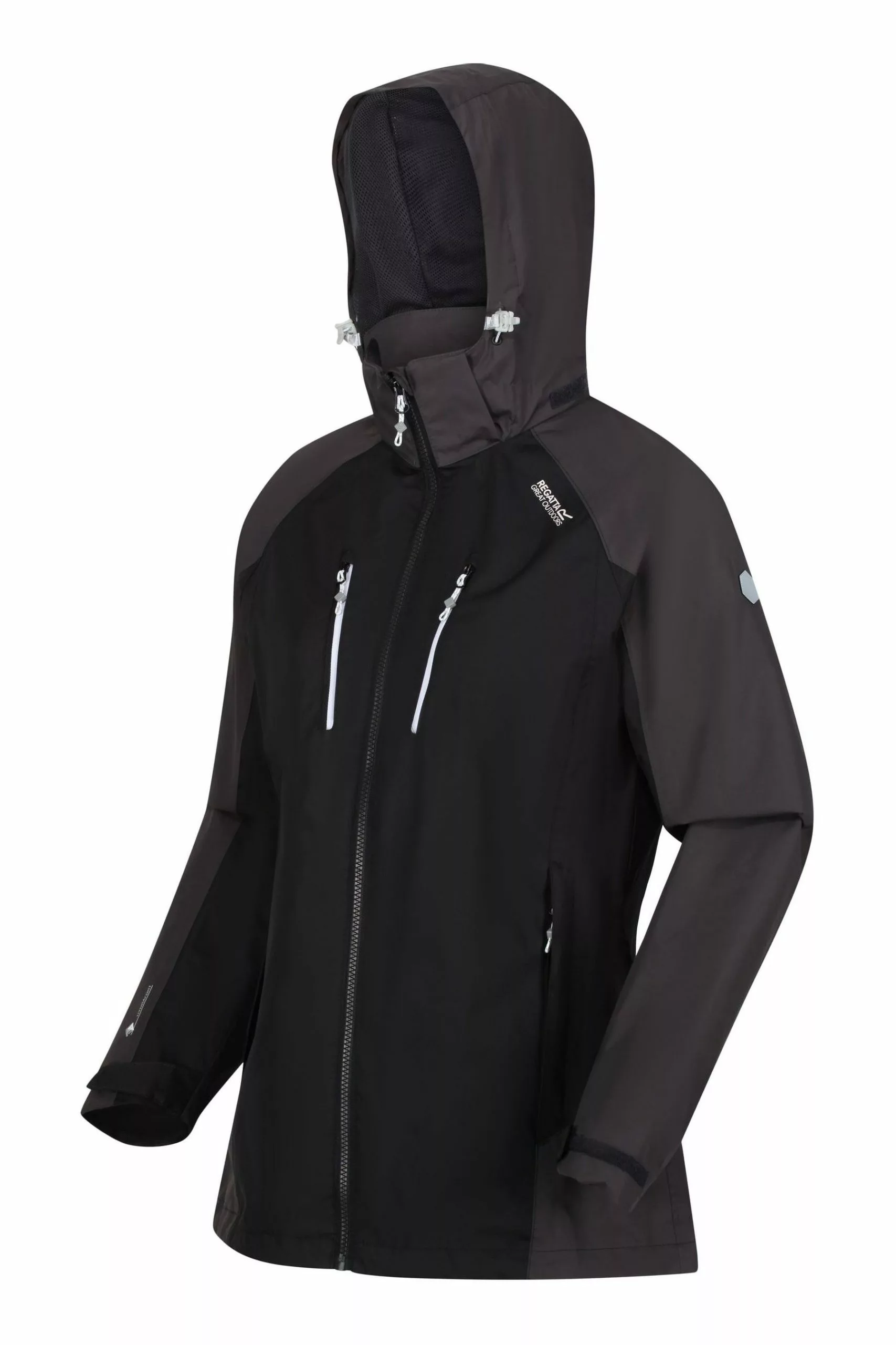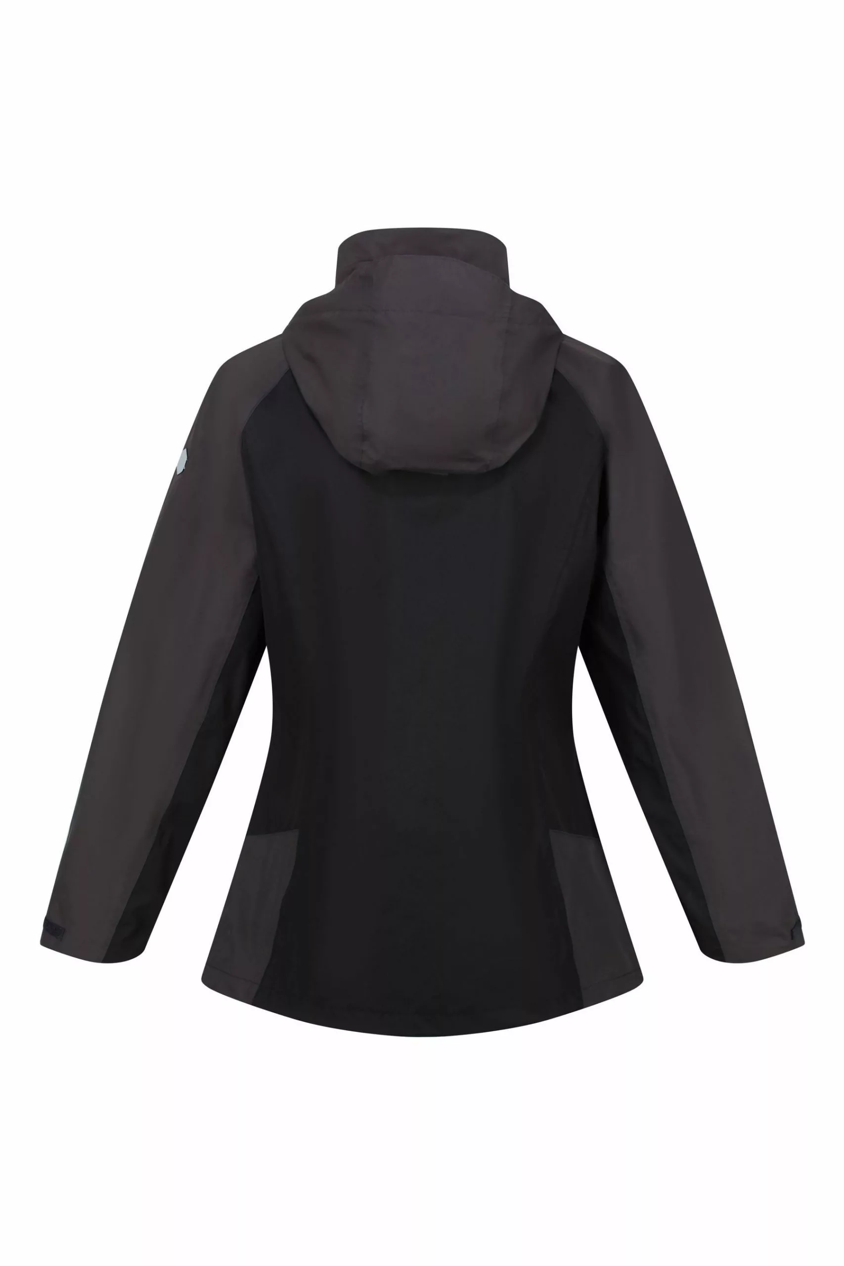 The women's Calderdale Jacket from Regatta is made of waterproof Hydrofort fabric with a soft-touch lining. Features include: an adjustable hood that rolls down and packs away with a neat design, an easy adjust shockcord hem and multiple pockets. With the Regatta Outdoors print on the chest.