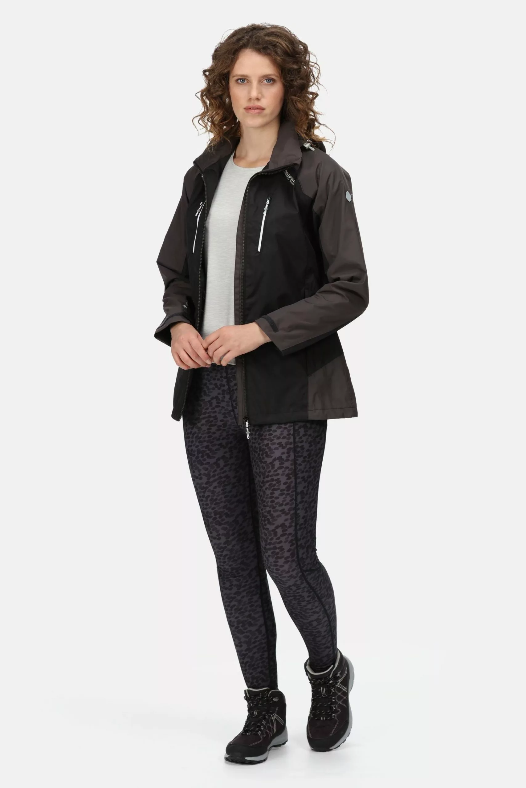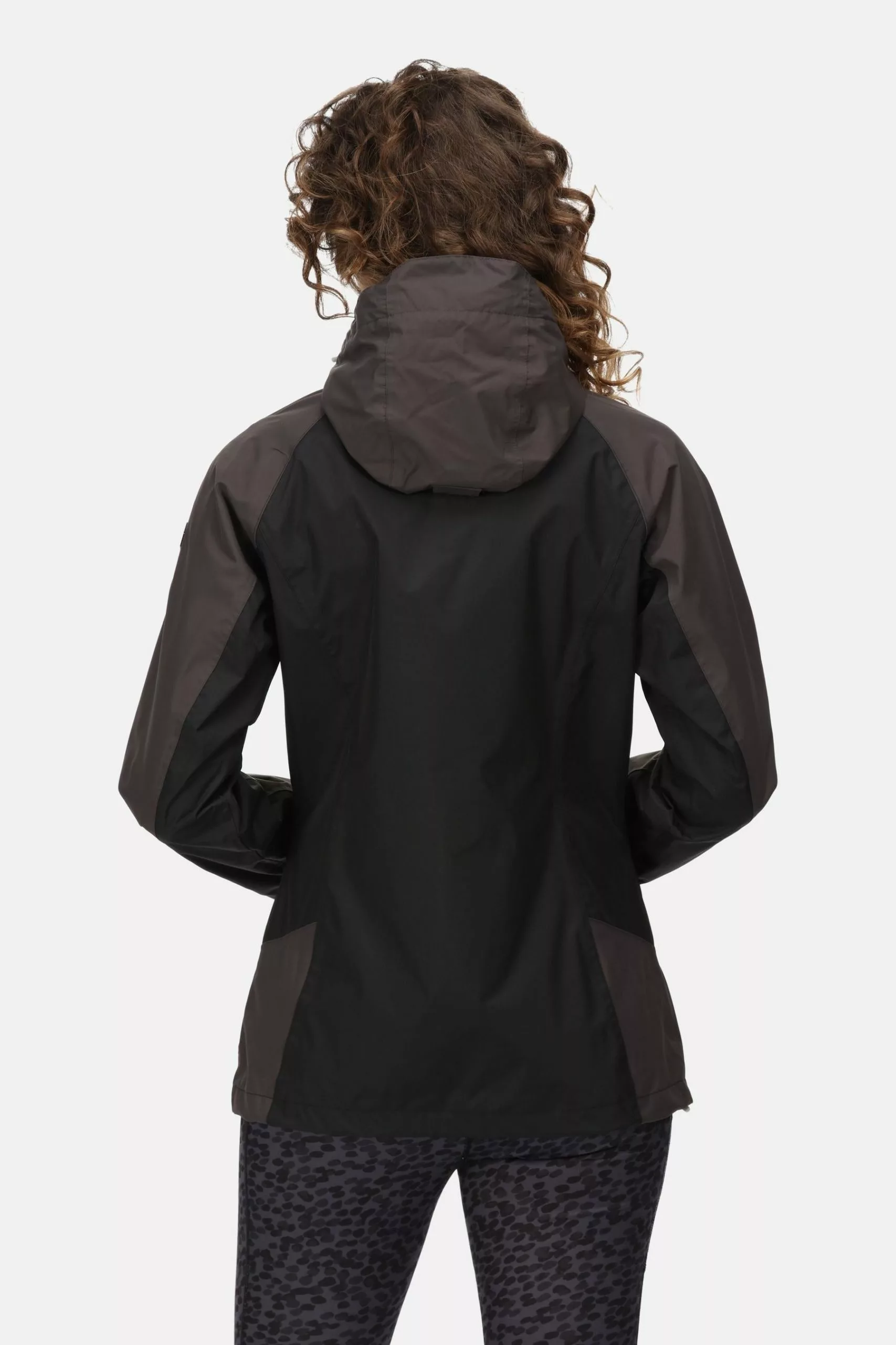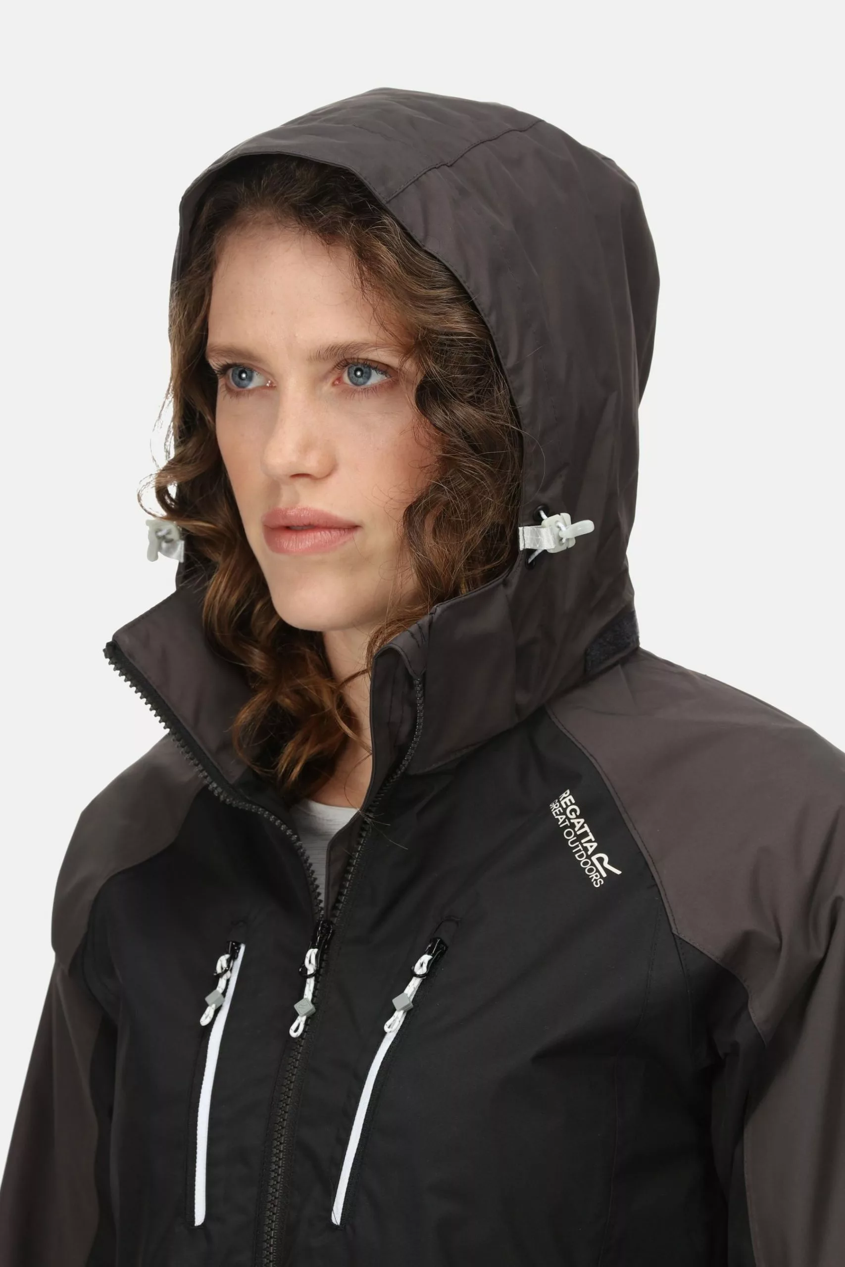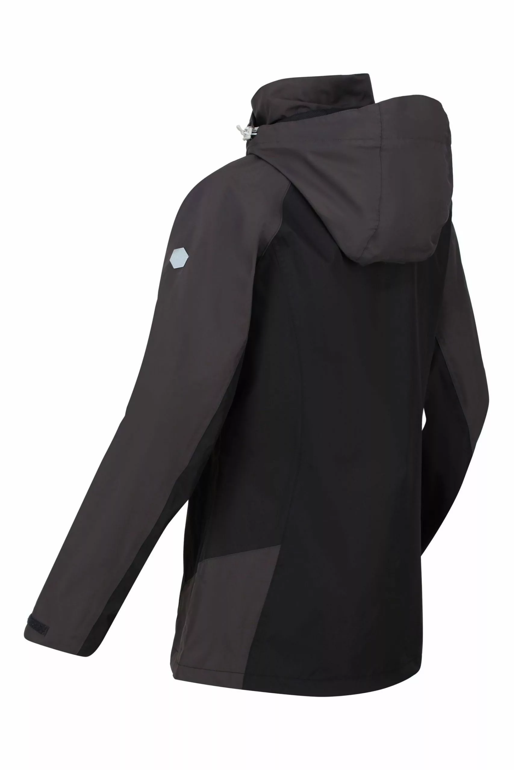 The women's Calderdale Jacket from Regatta is made of waterproof Hydrofort fabric with a soft-touch lining. Features include: an adjustable hood that rolls down and packs away with a neat design, an easy adjust shockcord hem and multiple pockets. With the Regatta Outdoors print on the chest.